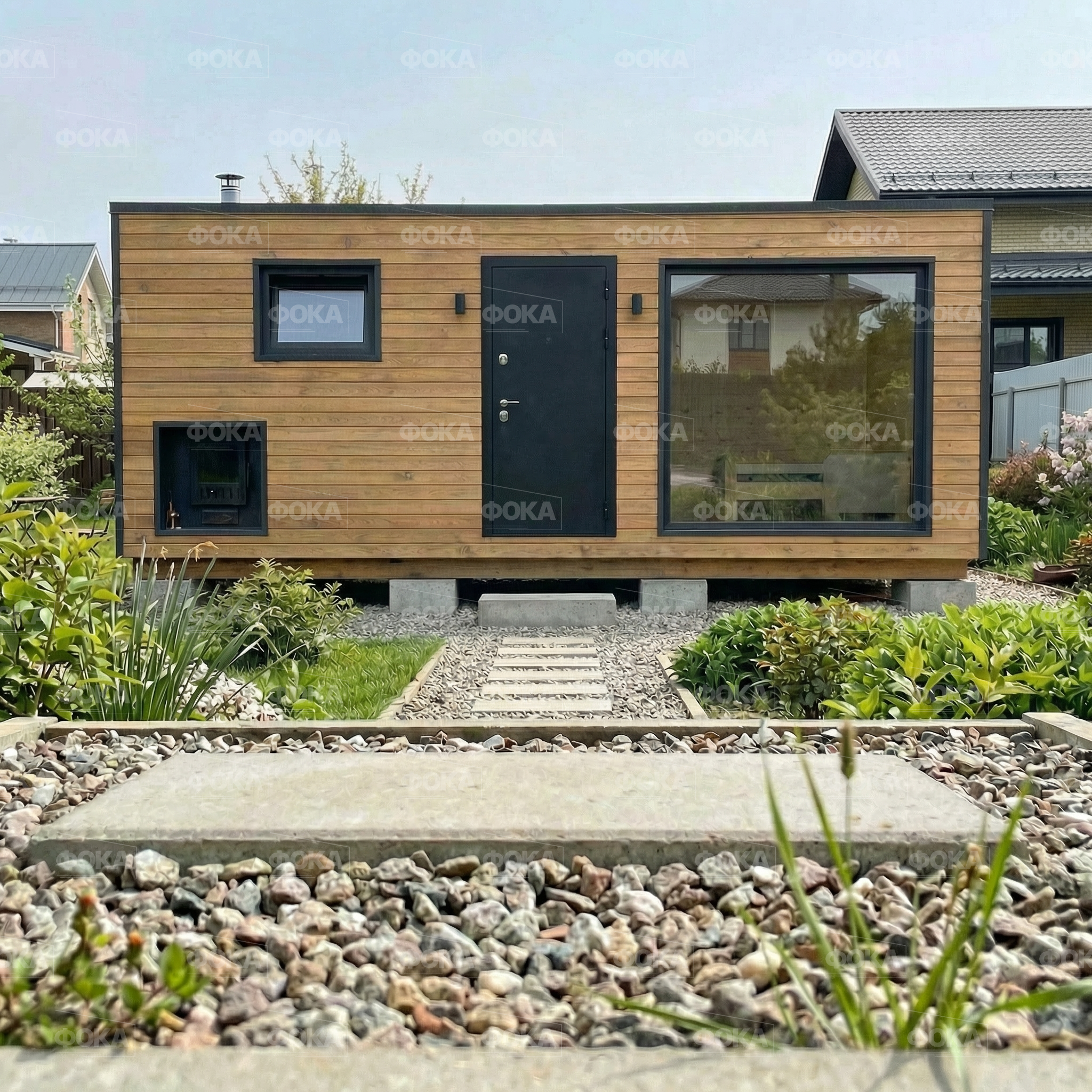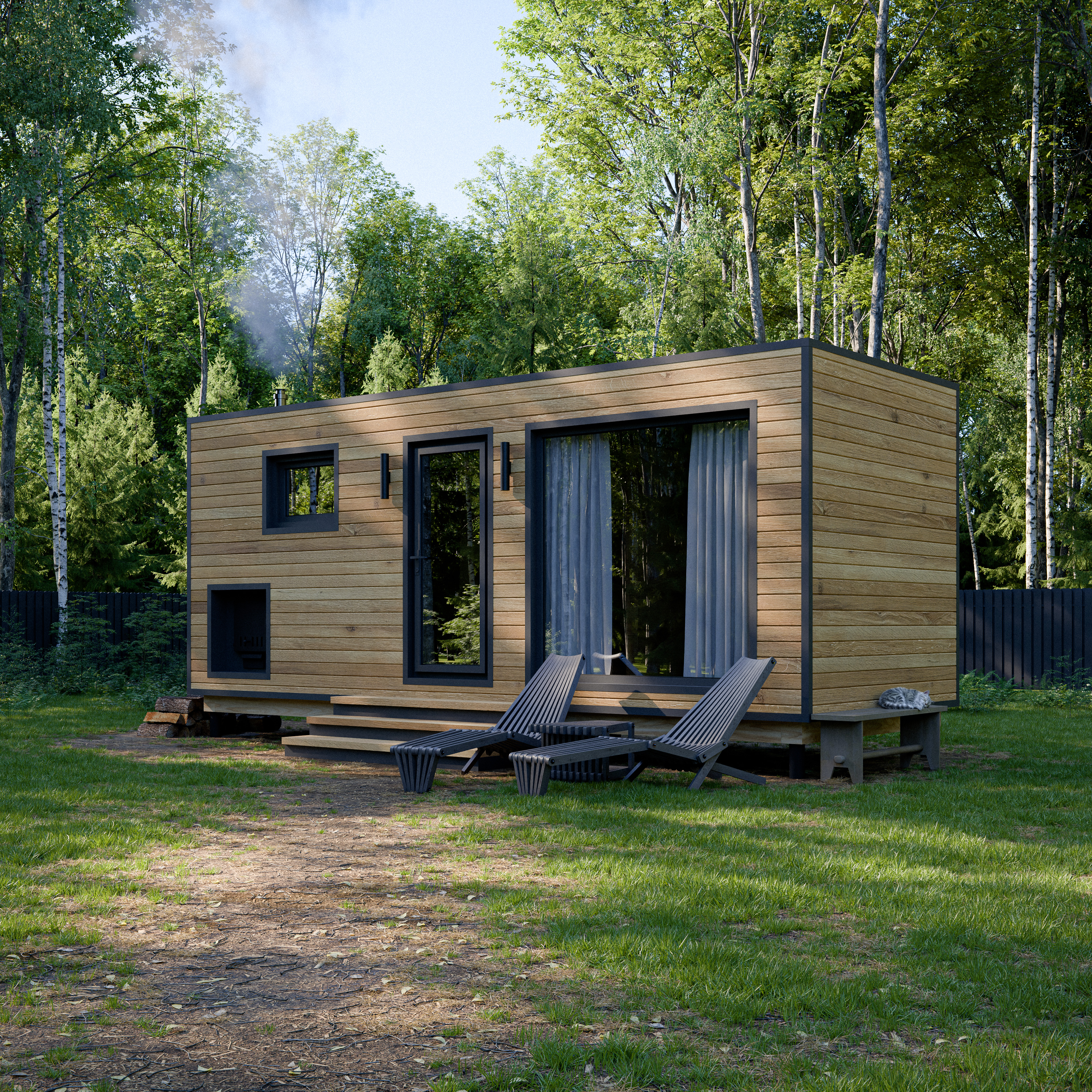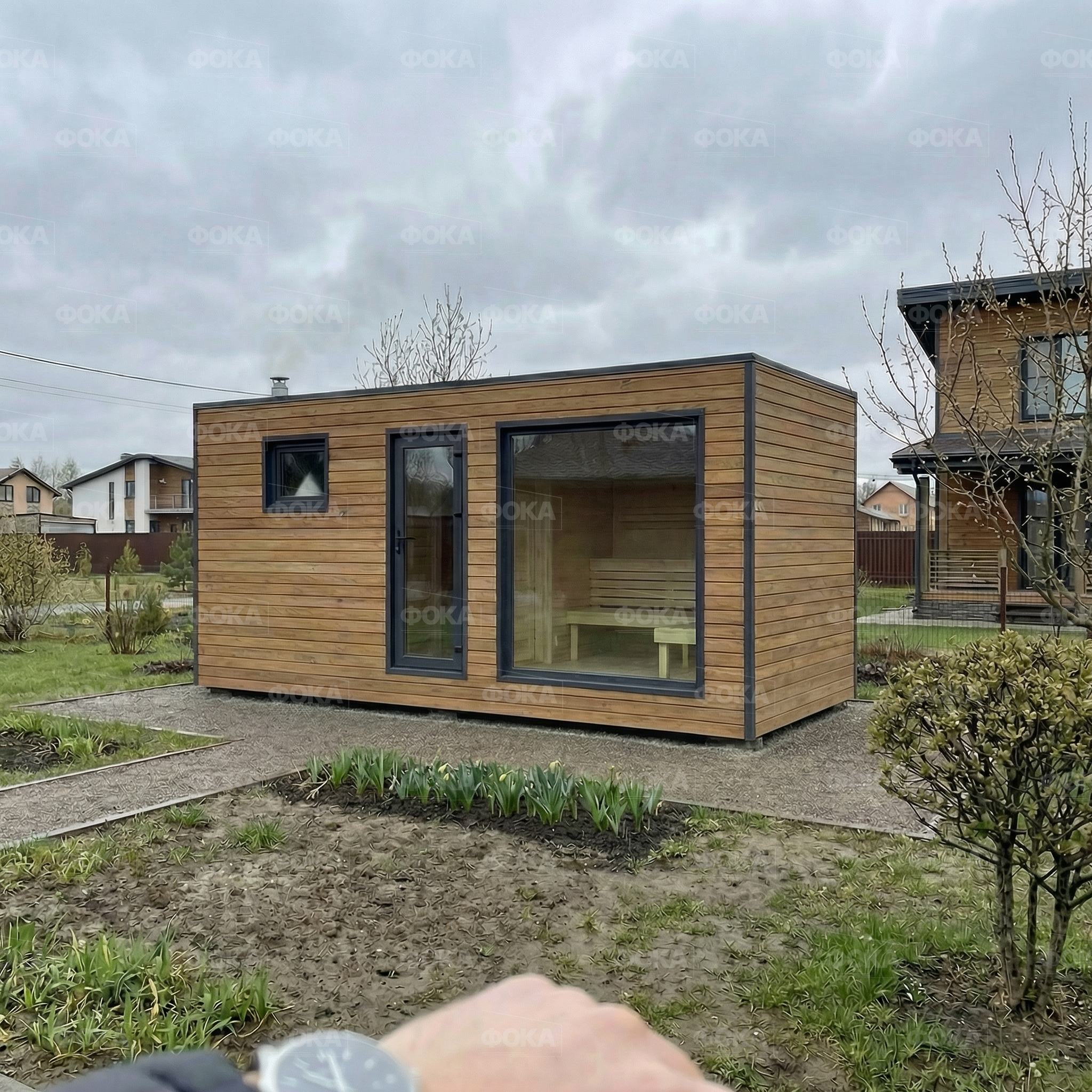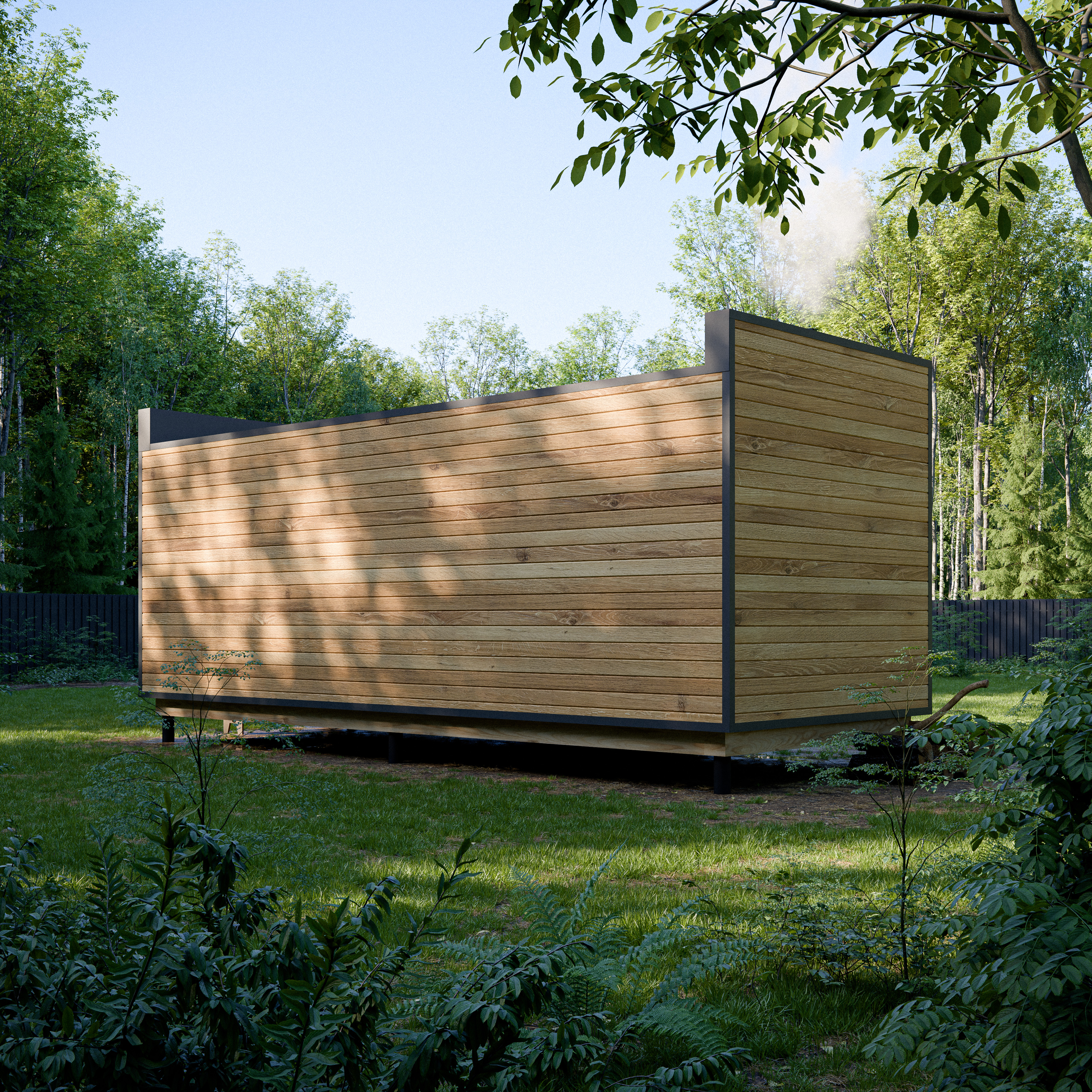 Современный внешний вид, который идеально впишется в дизайн вашего участка. Удобная планировка, включающая в себя парное отделение, зону отдыха и душевую.
